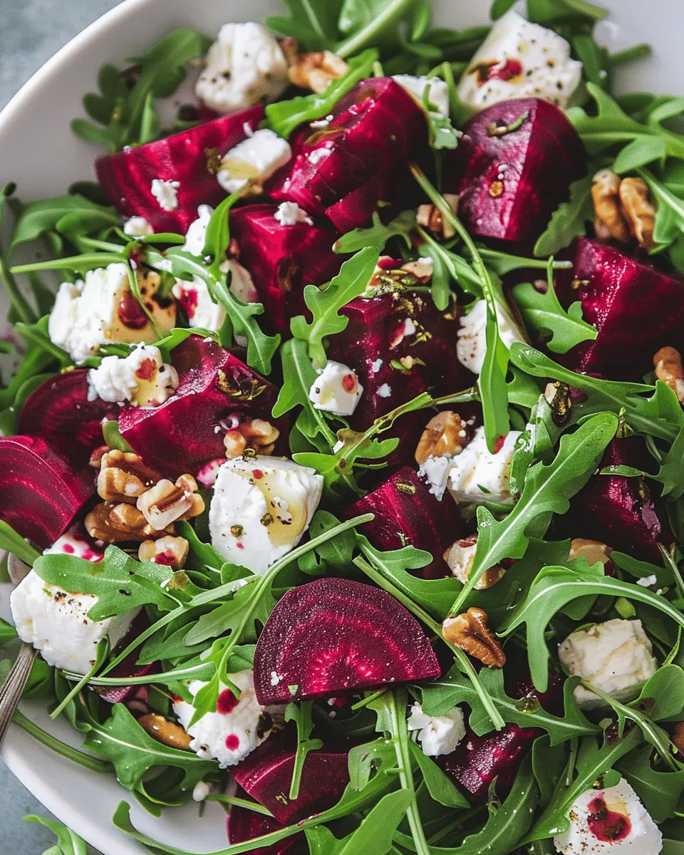 A vibrant salad with earthy beets, creamy goat cheese, and peppery arugula, perfect for a quick meal.
