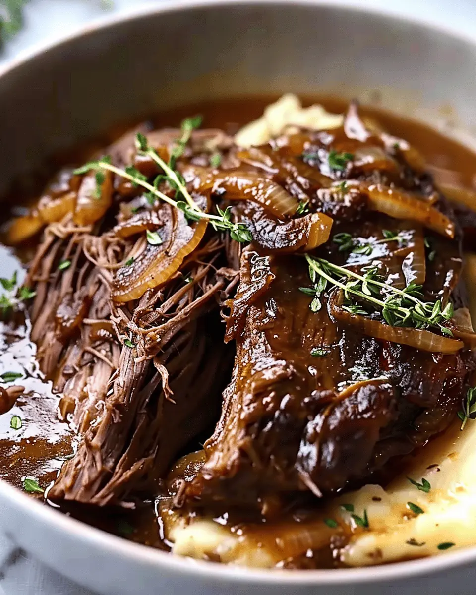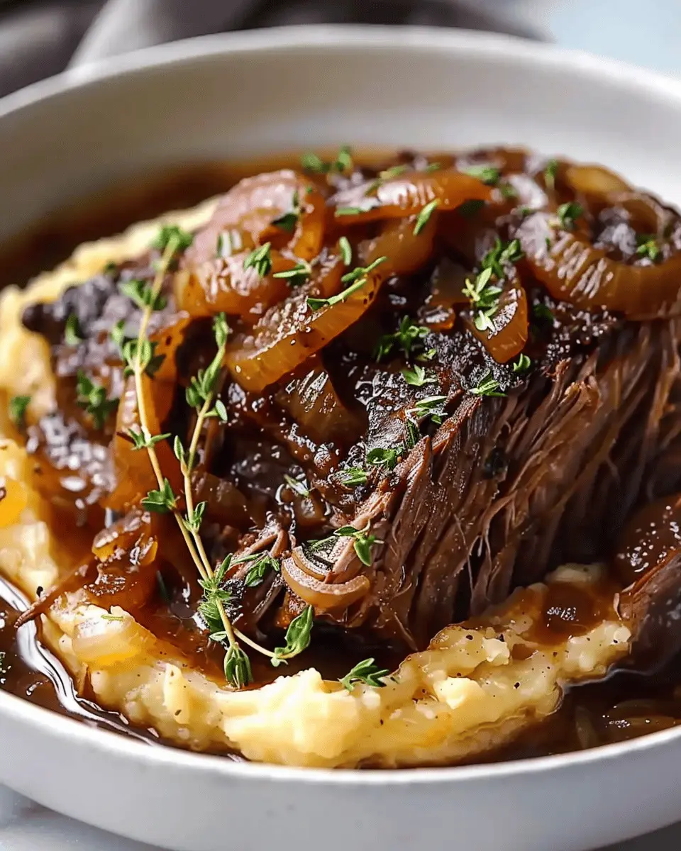 Enjoy a delicious Comforting French Onion Pot Roast that combines the savory flavors of slow-cooked beef with the crispy goodness of turkey bacon.