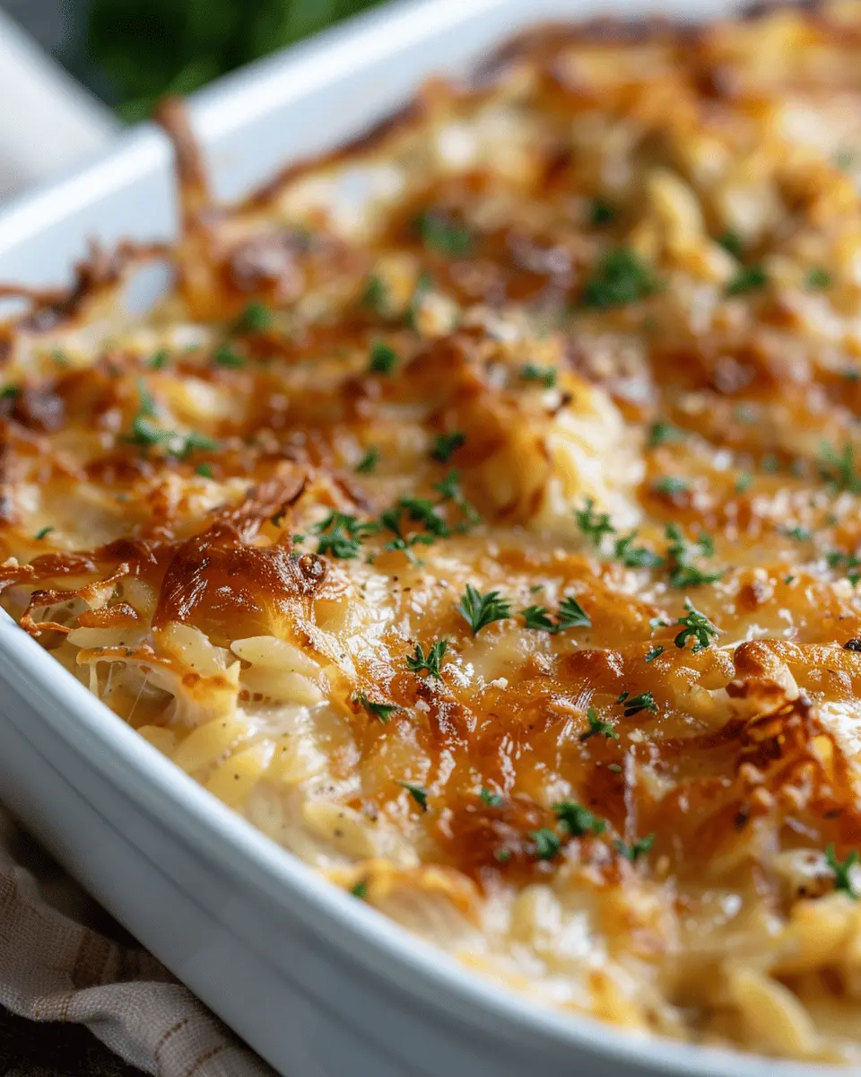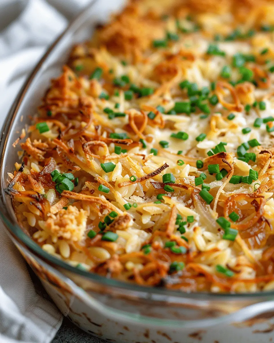 A delicious and comforting casserole featuring tender chicken, savory French onion flavors, and hearty orzo pasta.