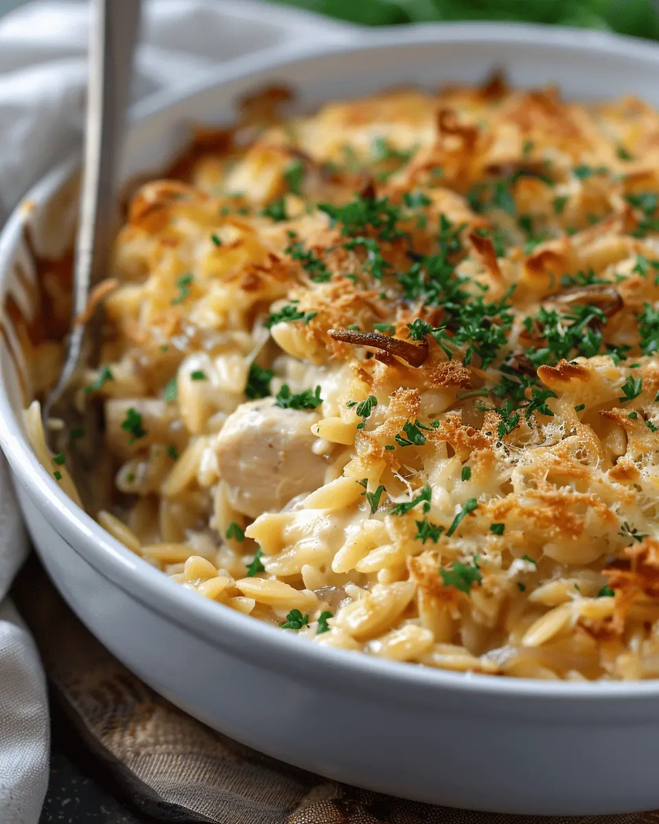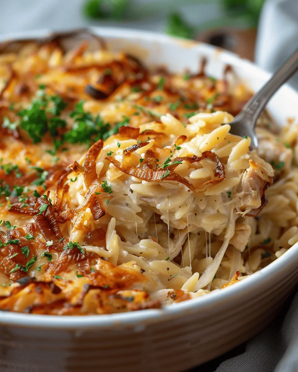 A delightful casserole combining the flavors of French onion soup with tender chicken and orzo, topped with crispy turkey bacon.