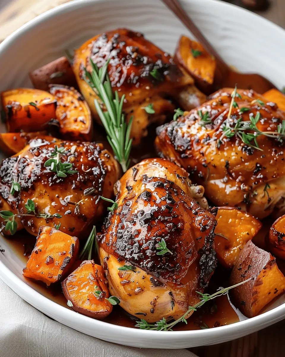 In summary, Maple-Glazed Chicken with Sweet Potatoes is a perfect blend of sweet and savory that delights the palate. The succulent chicken, bathed in a rich maple glaze, paired with tender sweet potatoes creates a meal that is both satisfying and nutritious. This dish not only pleases the taste buds but also offers a beautiful presentation that will impress your dinner guests.