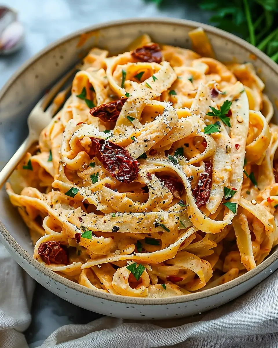 Once you’re set, the cooking part will take roughly 20 to 25 minutes. While the pasta is boiling, you’ll whip up that creamy sauce and sauté those glorious sun-dried tomatoes to perfection.